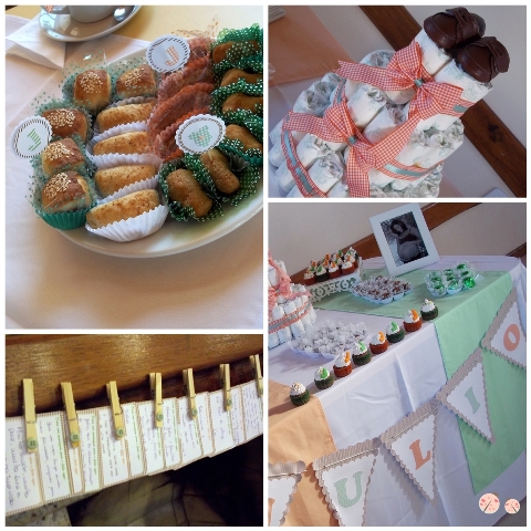 O Chá de Bebê do Julio aconteceu nesse último domingo e eu já mostrei para vocês os convites. Agora, vou mostrar como ficou a decoração. As cores principais eram laranja e verde para fugir do tradicional azul/branco ou azul/marrom. Não que essas combinações não sejam bonitas, mas o verde/laranja deu uma alegrada e já anunciou que o Julio virá em um ambiente de muita alegria e amor.